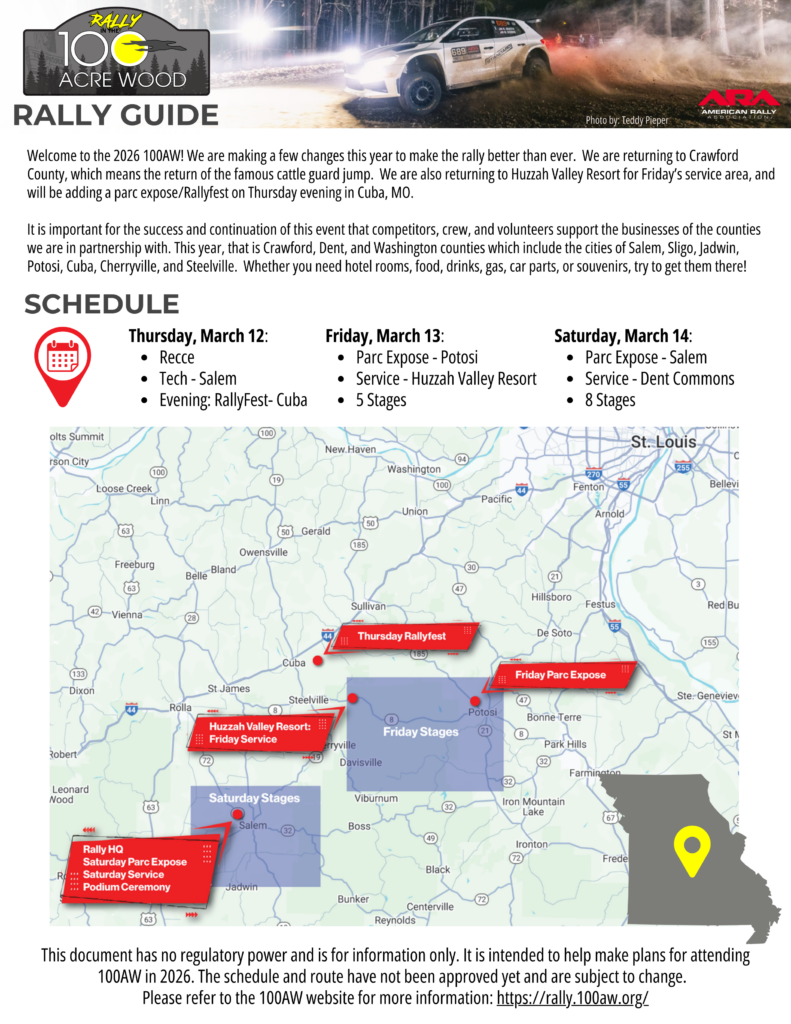 Welcome to the 2026 100AW! We are making a few changes this year to make the rally better than ever. We are returning to Crawford