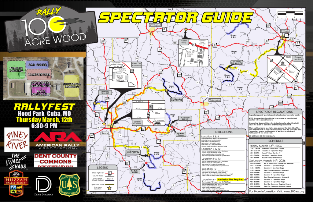 We are excited to announce a new addition to this years rally! RallyFest! Working with the City of Cuba, MO, we have added a new event to bring the stars and cars of the American Rally Association to the fans. Come join us Thursday March 12th, at Hood Park in Cuba, MO.